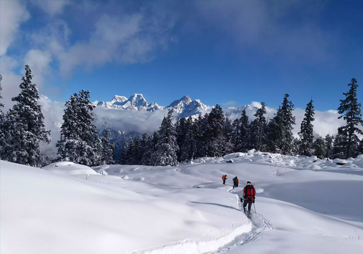 After breakfast get ready for trek. After half km we enter an opening called Chitrakantha. The view which was constrained by the Jungle starts opening from here. The trail curves gradually westwards as we move closer to Kuari Pass. Some of the prominent peaks which are visible are Chaukhamba, Mt. Kamet, Neelkantha and Bharirathi 1, 2, 3. The highest altitude on this trek which is 3876 M is reached about 700 Meters before the Kuari Pass (3504 M). Packed lunch would be served. After spending some time at the pass we retrace the same route to reach Kulara Tali by late afternoon (6 kms trek). Dinner and overnight stay in camp at Kulara.